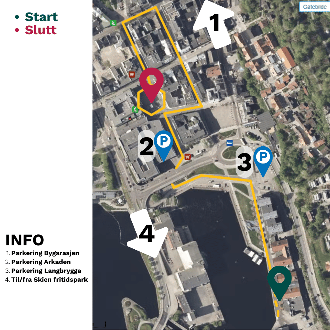 Vi oppfordrer alle til å bruke kollektiv transport via appen Farte. Skien har gode bussforbindelser mellom togstasjon, Skien fritidspark og Skien sentrum. For de som kommer med bil kan parkeringshusene Bygarasjen og Arkaden benyttes. Langbrygga har også en liten offentlig parkeringsplass som kan brukes. Utover dette er det flere steder i sentrum som har gateparkering, men dette fylles fort opp. Merk at man må betale for parkering i sentrum, både i gata og i parkeringshus.