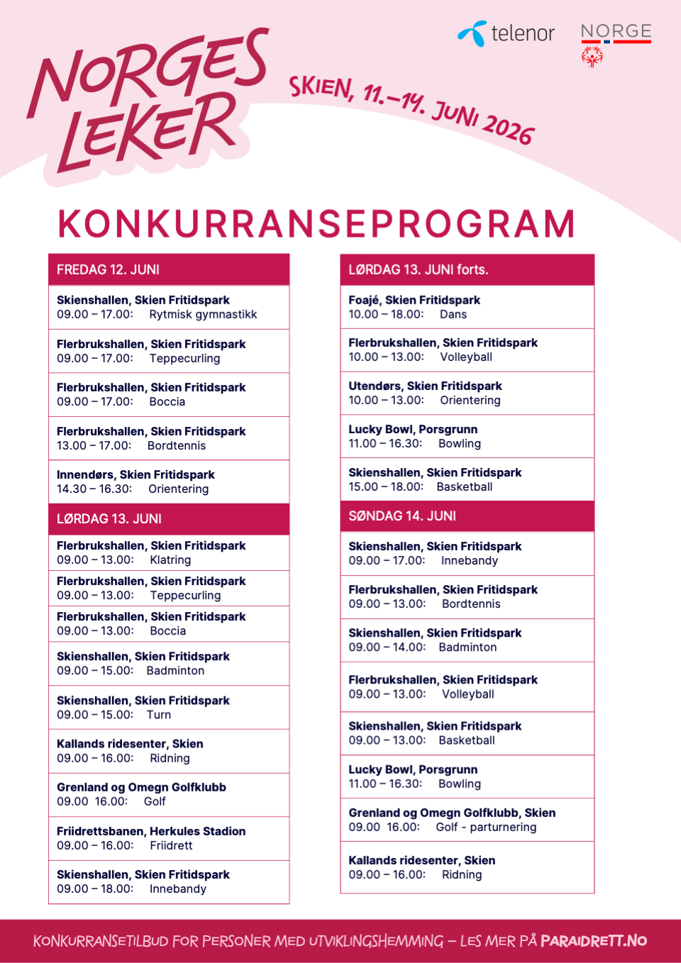Søndag er siste konkurransedag under Norgesleker 2026. I Skienshallen spilles det kamper i innebandy og basket, mens badminton, bordtennis og volleyball står på programmet i Flerbrukshallen.